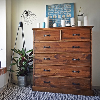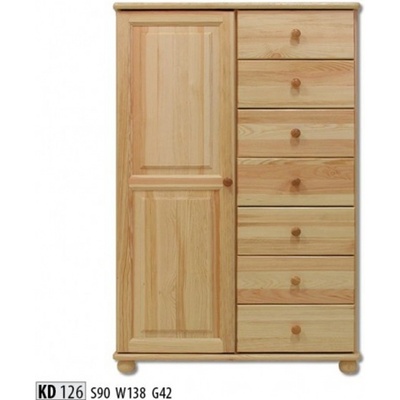 Praktická komoda vyrobená z masívneho borovicového dreva, kotrá poskytuje veľké množstvo úložného miesta. Disponuje až siedmimi zásuvkami a jednou veľkou bočnou skrinkou....